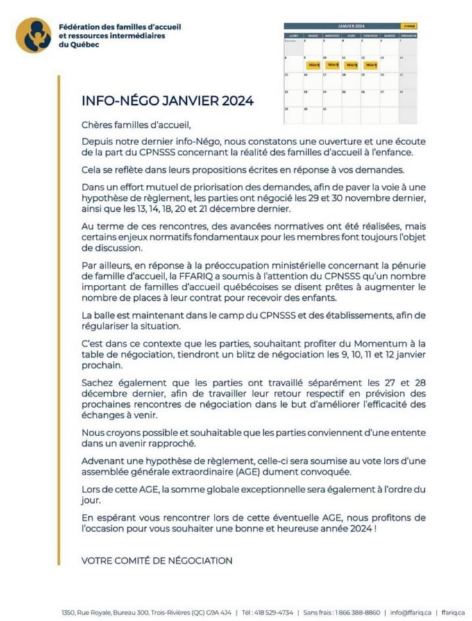 Le bulletin d’octobre 2024 dresse le portrait de tous les efforts faits par la FFARIQ depuis le 15 mai 2023 pour renouveler l’entente collective des familles d’accueil. Le manque d’avancées significatives sur les enjeux fondamentaux a pour conséquence que des moyens de pression ont été déclenchés.